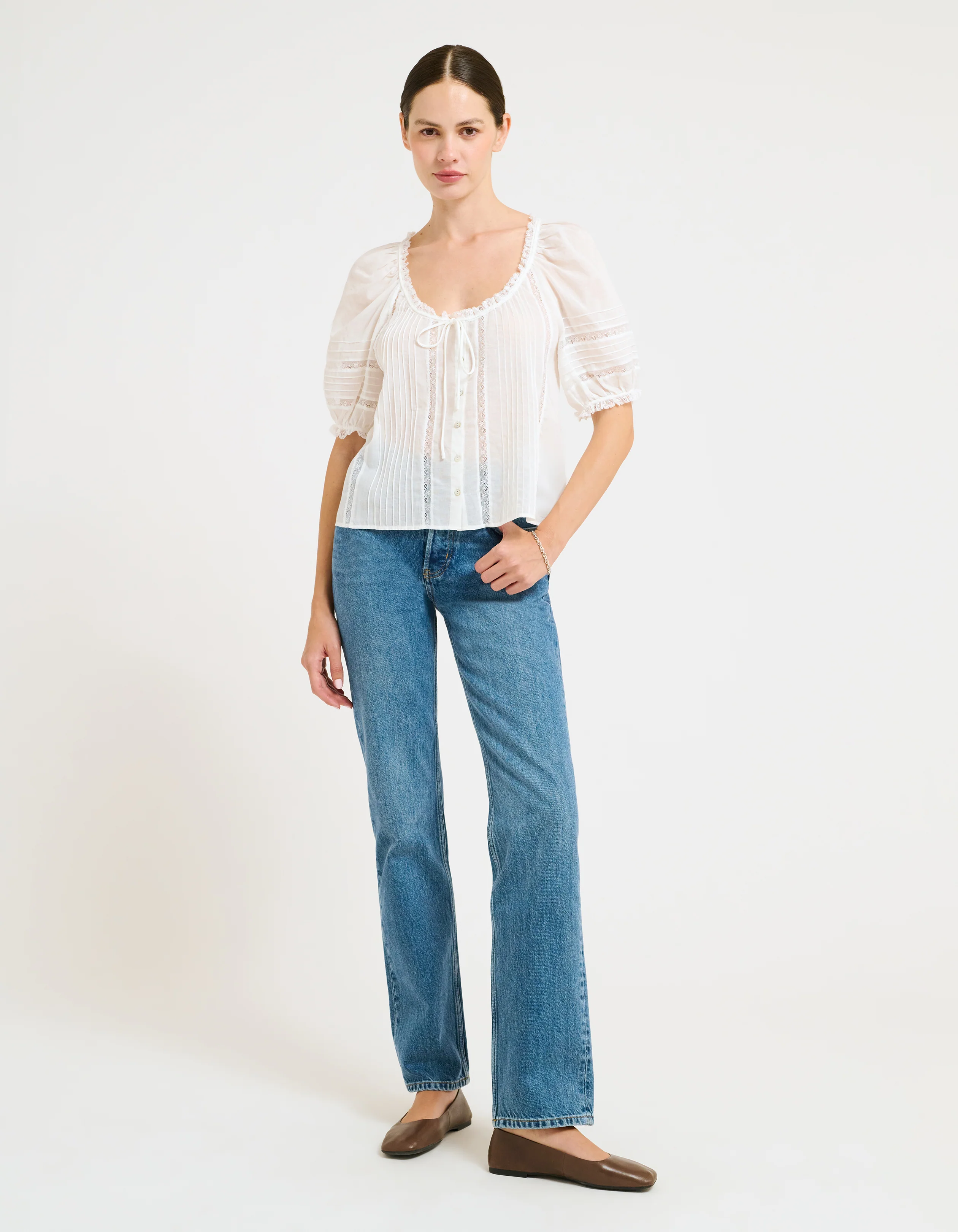 The Prairie Top is pure countryside charm—crafted from airy cotton voile with intricate inset lace, delicate micro pleats, and a dainty self-tie at the center. Light, romantic, and brimming with vintage-inspired sweetness.