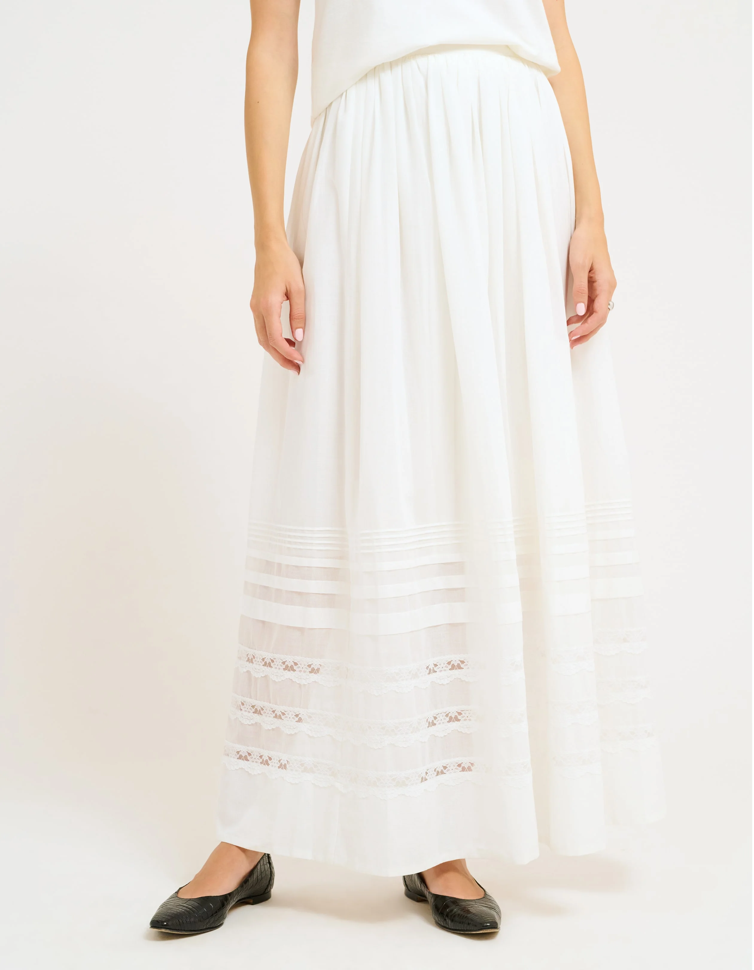 Romantic and easy, the Wildflower Maxi Skirt is made from airy cotton voile with pintuck and lace detailing that feels timeless. Its elastic waist makes it effortless, while the full, lined shape carries you through seasons—barefoot in early spring, with sandals on warm days, or with boots and a sweater deep into fall.